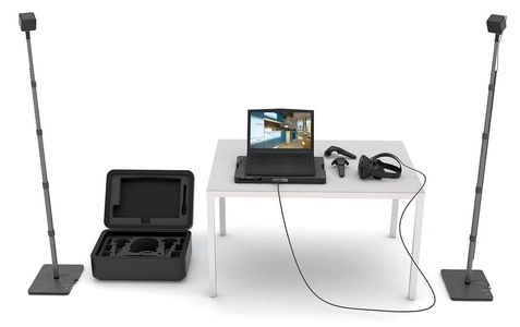 Each system includes a headset, 2 controllers and 2 base stations on stands that can be set up anywhere